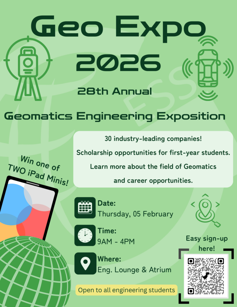 Join us and 30 industry-leading companies for an exciting day exploring the growing Geomatics field and the career opportunities it offers. Whether you’re a first-year student or looking to connect with industry professionals, this is an event you won’t want to miss.
